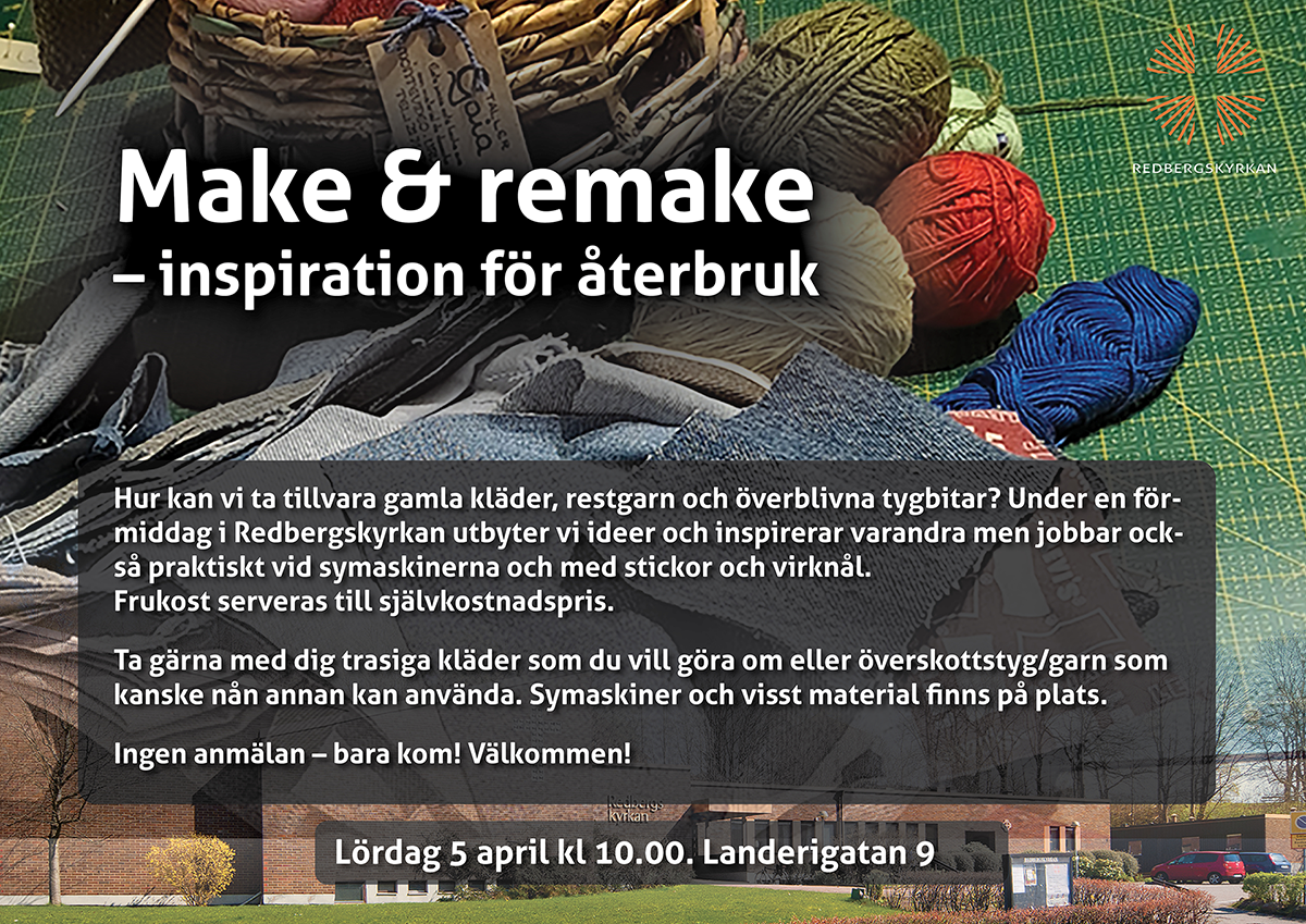 Hur kan vi ta tillvara gamla kläder, restgarn och överblivna tygbitar? Under en förmiddag i Redbergskyrkan utbyter vi ideer och inspirerar varandra men jobbar också praktiskt vid symaskinerna och med stickor och virknål.
